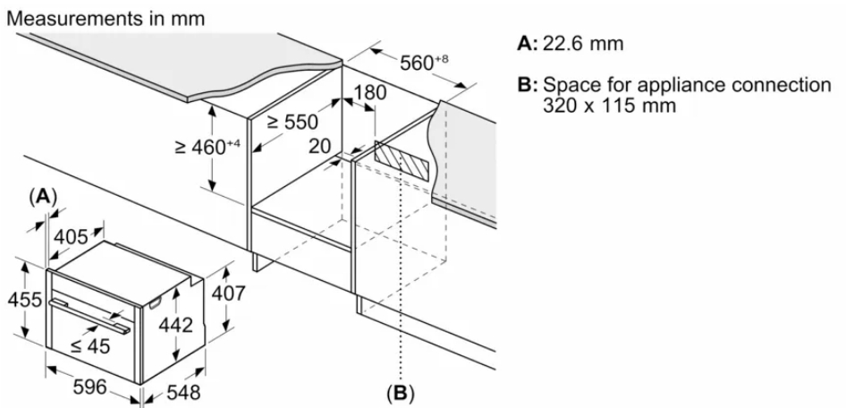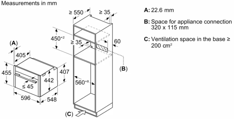 • Размеры ниши для встраивания, см (В х Ш х Г): 45-45.5 х 56-56.8 х 55
