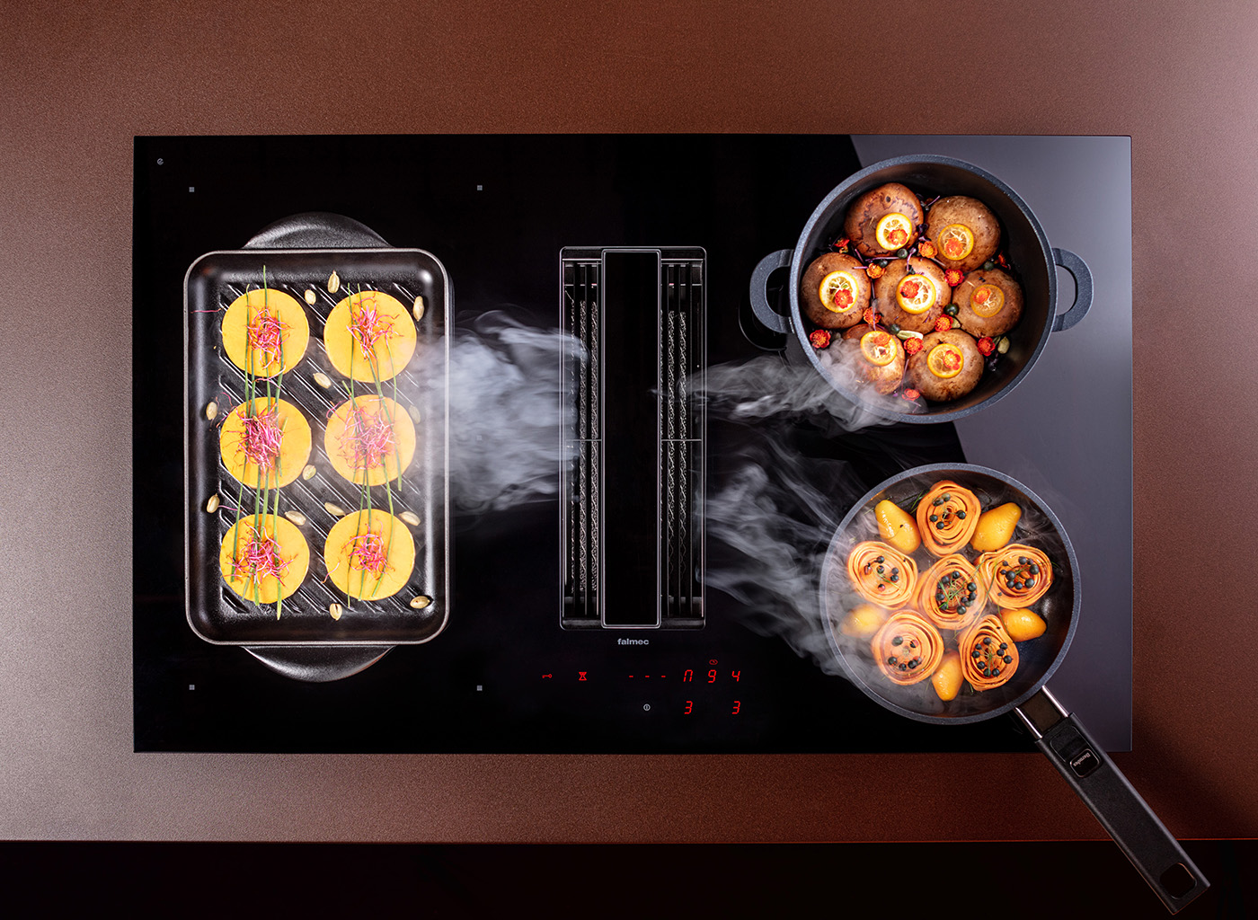 Особенности модели восстановление настроек варочной панели в случае случайного выключения, функция поддержания тепла: максимальная температура 70°, 9 уровней приготовления + функция Power (Over Boost), автоматический режим (скорость вытяжки автоматически регулируется в зависимости от мощности приготовления), емкость для сбора жидкости, возможность установки в один уровень со столешницей.