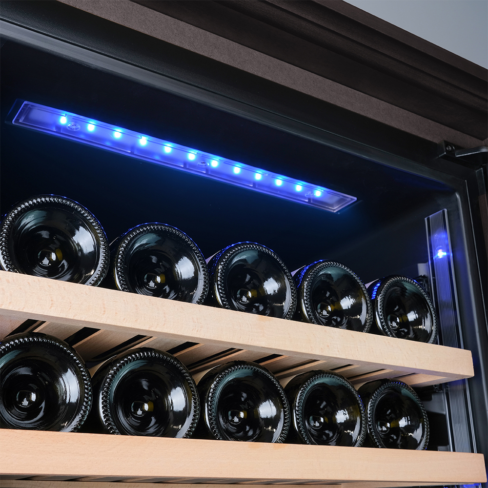 Несомненно, Вас порадует наличие панорамного светодиодного освещения (подсвечивает каждую полку), которое имеет три цвета - белый, янтарный и синий. Оно не выделяет тепло и следовательно - не нагревает бутылки с вином. Так что Вы сможете эффектно демонстрировать Вашу винную коллекцию.