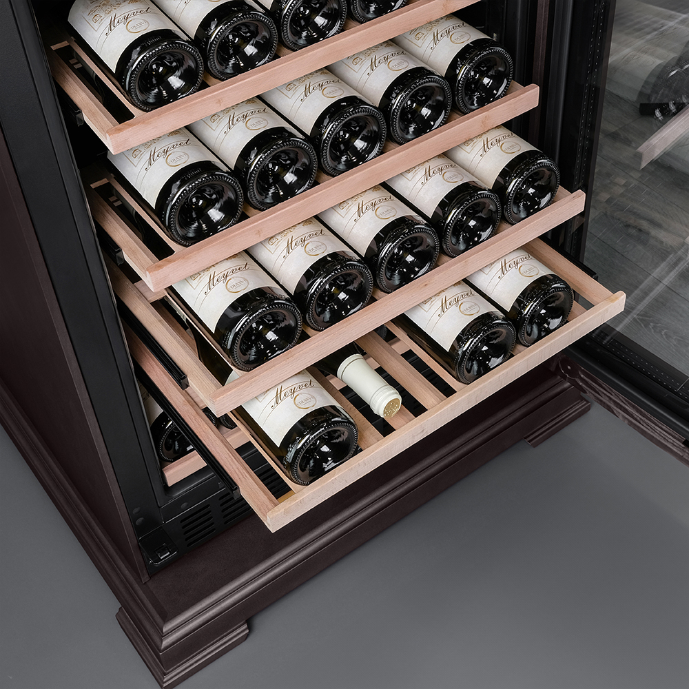 Полки выполнены из массива бука. Этот натуральный и крепкий материал не только имеет красивую текстуру, но и прекрасно гасит небольшую вибрацию. Так что Ваше вино будет храниться в абсолютном покое.